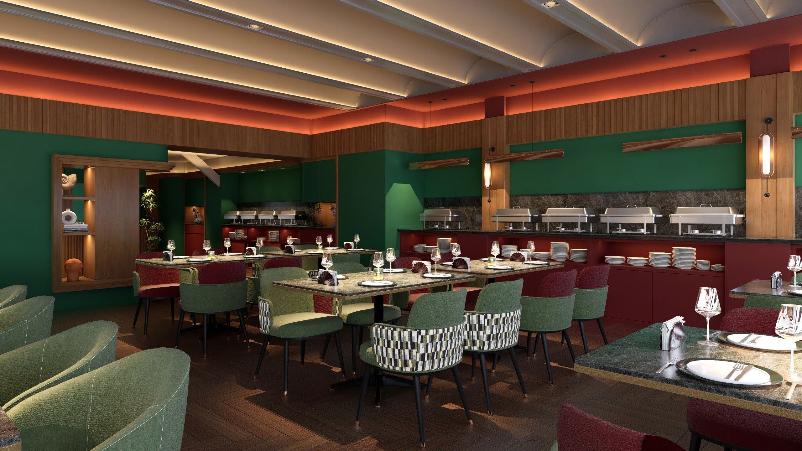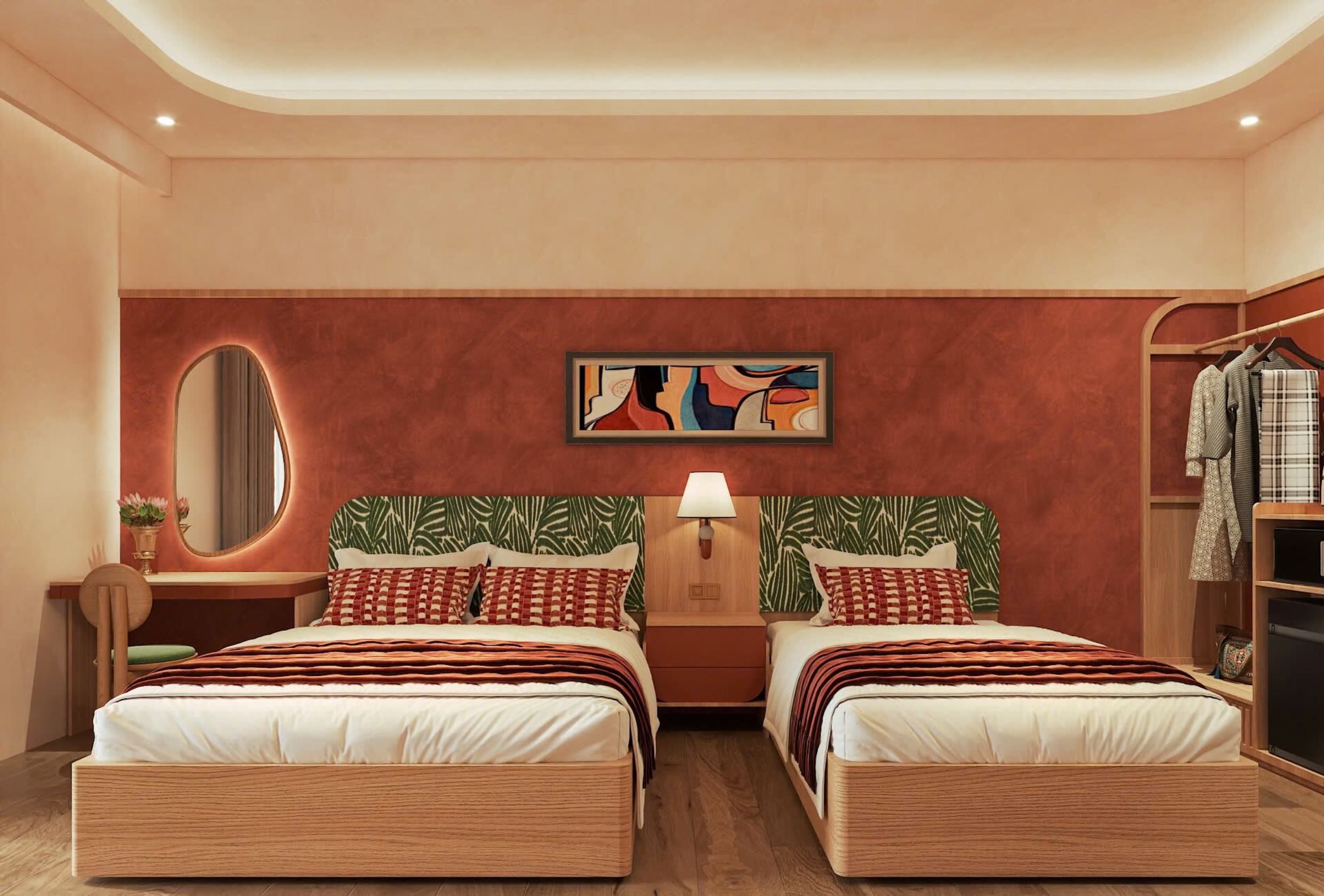 Inside, the hotel carries NiK’s familiar green-toned identity in a more refined, urban setting. Deep teal hues create a grounded feel, balanced by warm lighting, natural wood finishes, and subtle red accents that add energy without overwhelming the space.