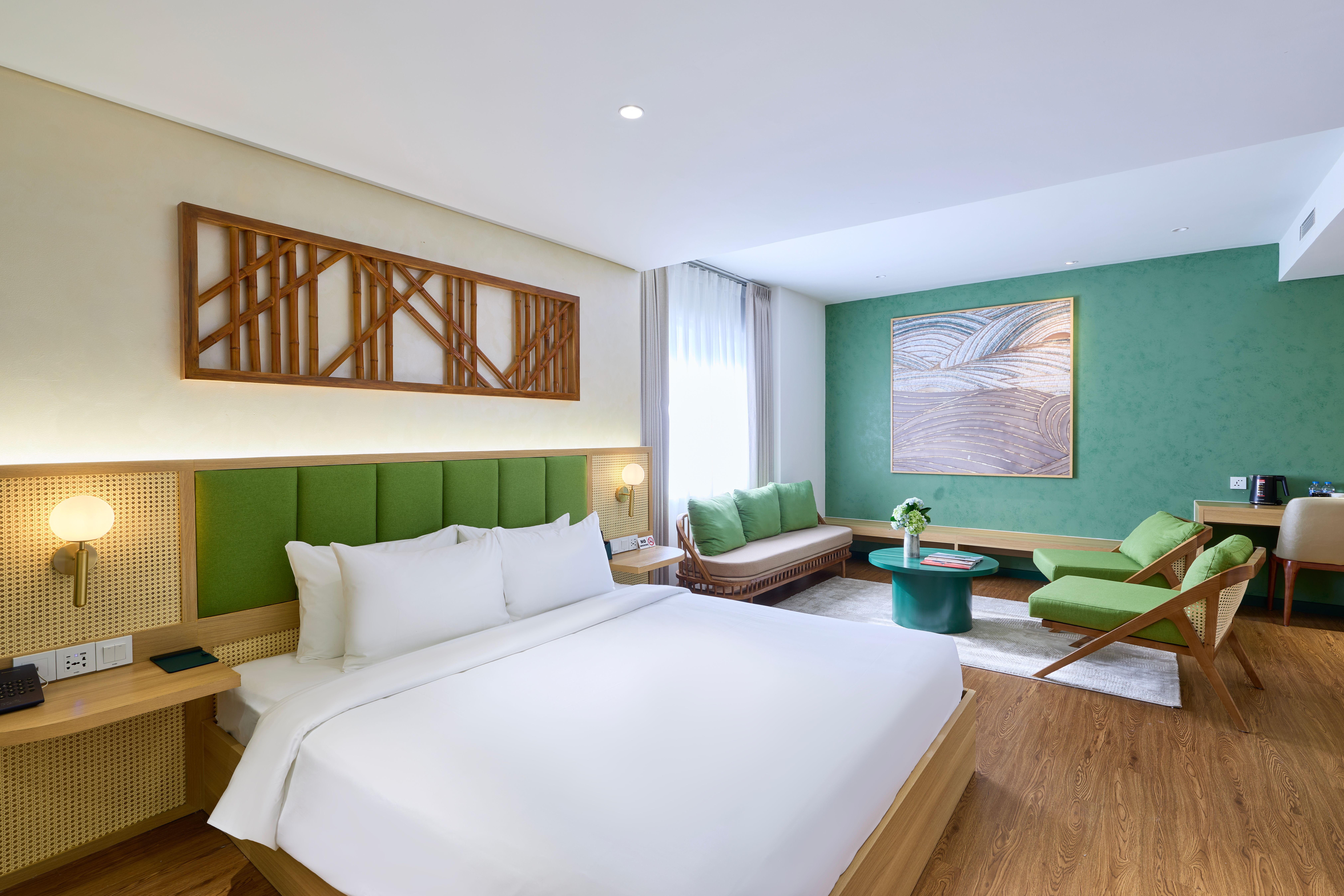 Rooms feel warm and well put together, with green tones, bamboo details, and wood textures that create a relaxed atmosphere without feeling over-styled. Guests can choose between compact no-window rooms that prioritize value, or upgraded rooms with balconies and city views.