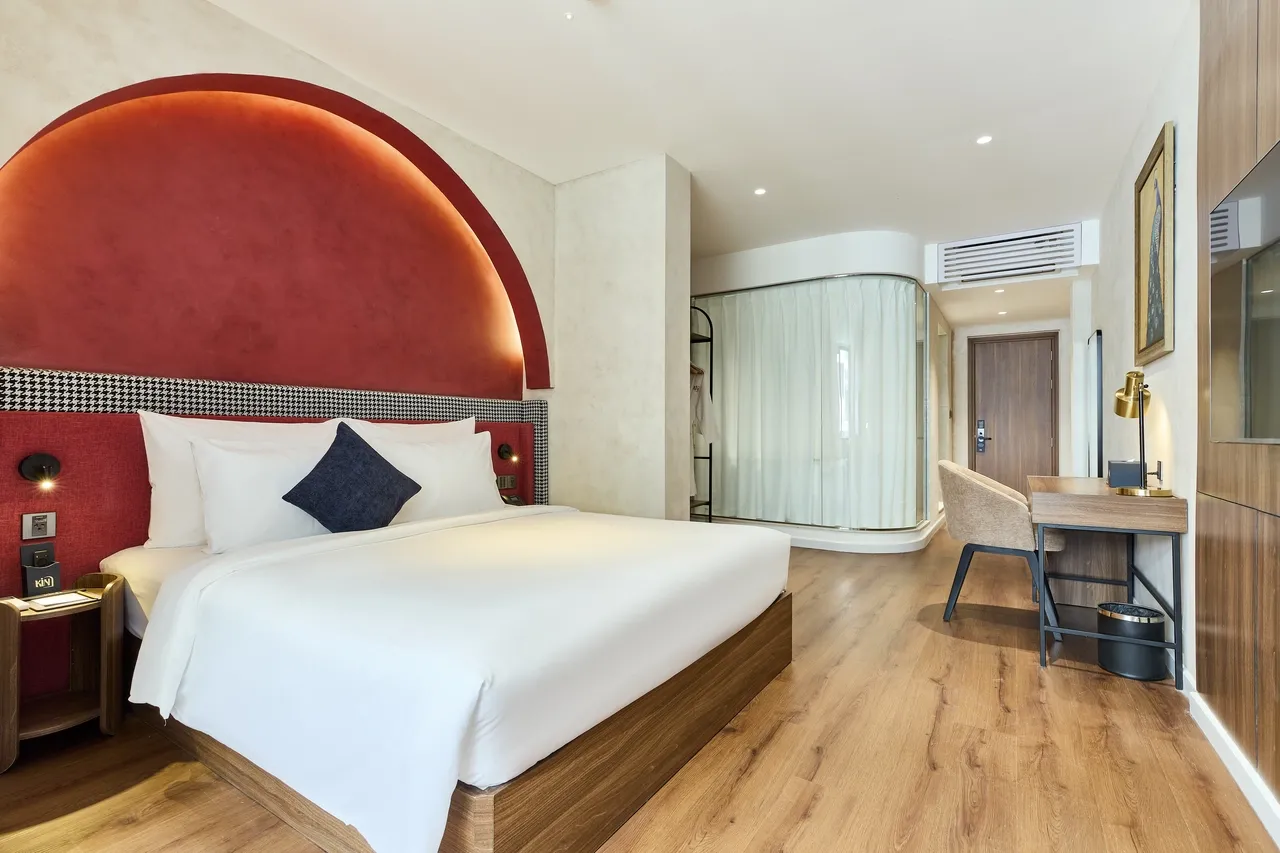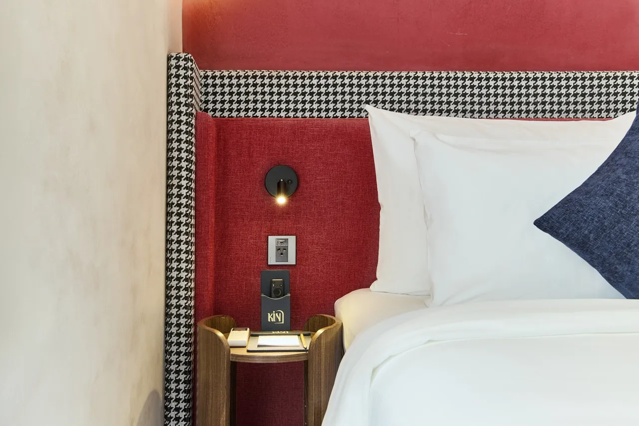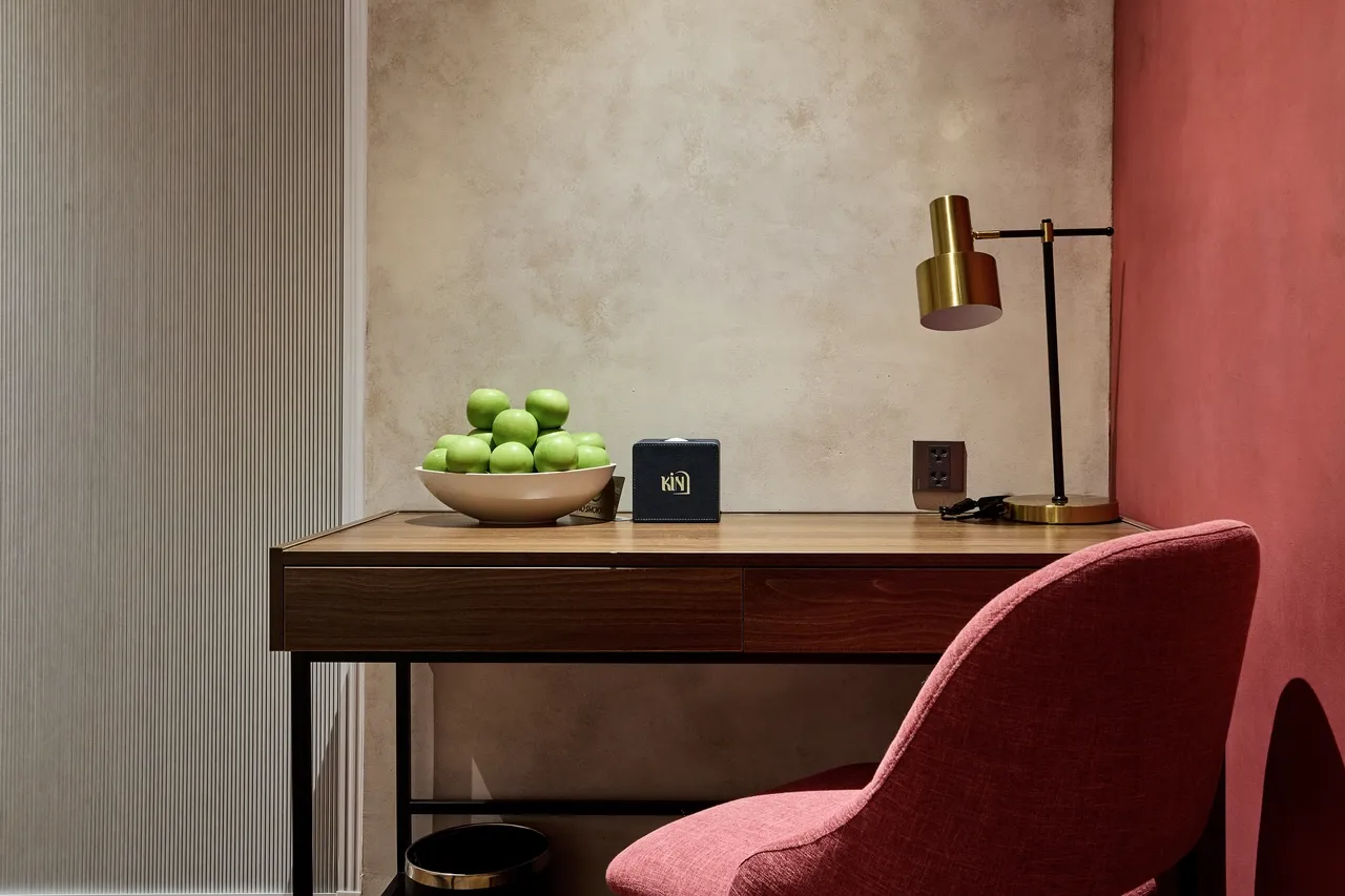 From the moment you enter, the design tells you this isn’t your standard big-box hotel. Kin takes inspiration from wine-red tones and velvet upholstery — not to show off, but to soothe.